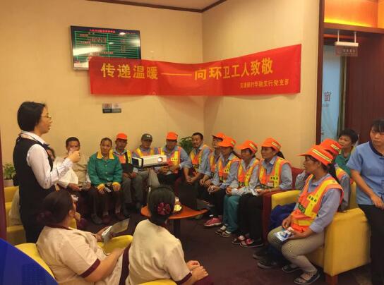 日前,交通銀行深圳華融支行黨支部在深圳華融大廈開展了"傳遞溫暖,向環(huán)衛(wèi)工人致敬"活動。