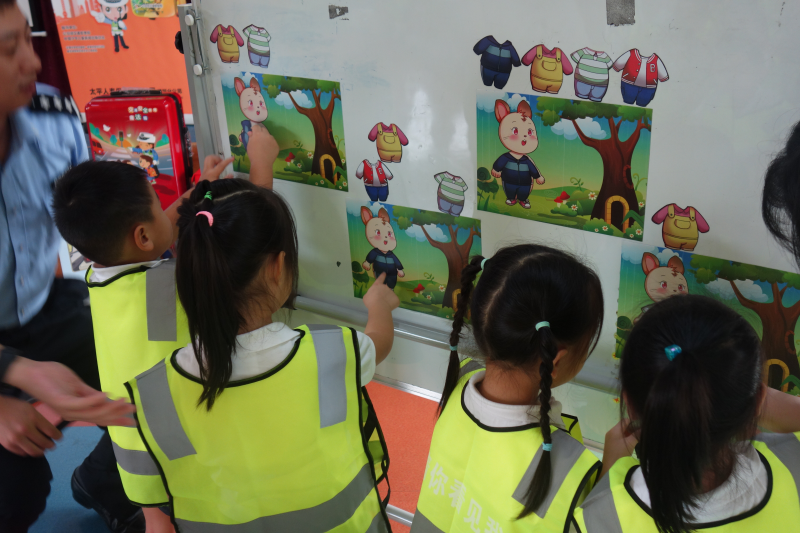 熊警官?gòu)慕煌üぞ咧v起,分別講述了乘坐不同交通工具所帶來(lái)的風(fēng)險(xiǎn)及注意事項(xiàng),并通過(guò)幽默風(fēng)趣的“兒童安全座椅”小視頻,提醒在座的小朋友及家長(zhǎng)要注意細(xì)節(jié),具有防范風(fēng)險(xiǎn)的意識(shí)。在互動(dòng)游戲環(huán)節(jié),熊警官通過(guò)與小朋友們的互動(dòng),講解了紅綠燈的來(lái)源、日常的交通標(biāo)識(shí)以及過(guò)馬路的規(guī)則?,F(xiàn)場(chǎng)的同學(xué)們也非常踴躍,在“被看見(jiàn)才安全”環(huán)節(jié)時(shí),許多小朋友主動(dòng)上臺(tái),給小兔子穿上最亮最顯眼的衣服,使其成為最靚的仔。