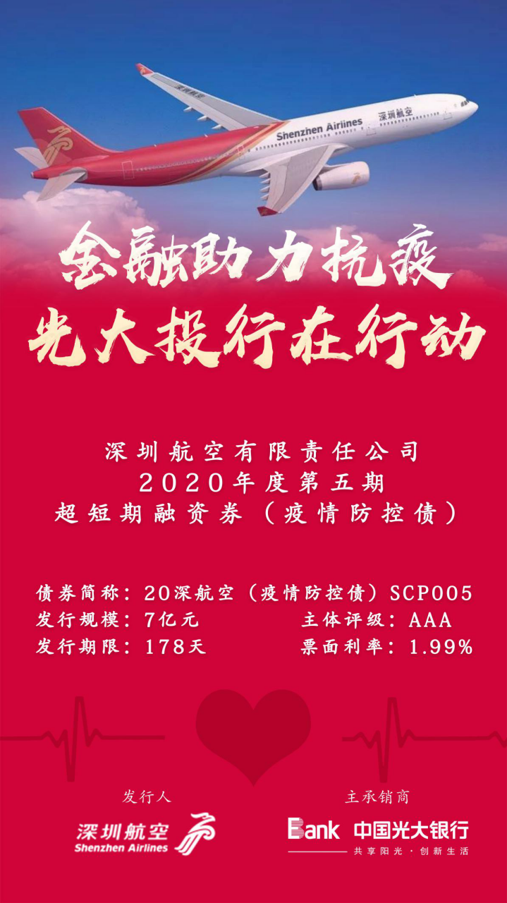深圳新聞網(wǎng)2月12日訊 為積極響應(yīng)國家抗疫號(hào)召,支持疫情防控企業(yè)債券融資,光大銀行總行戰(zhàn)投部和深圳分行迅速反應(yīng),堅(jiān)決貫徹落實(shí)光大集團(tuán)及光大銀行總行黨委關(guān)于新型冠狀病毒肺炎疫情防控的有關(guān)要求,于2月11日成功發(fā)行深圳航空有限責(zé)任公司2020年度第五期超短期融資債券(疫情防控債) ,發(fā)行規(guī)模7億元,期限178天,票面利率僅為1.99%。其中,2億元募集資金將用于補(bǔ)充深圳航空為旅客免費(fèi)辦理退票、改期等支出產(chǎn)生的營運(yùn)資金需求以及免費(fèi)提供防疫物資、醫(yī)療人員等運(yùn)輸產(chǎn)生的營運(yùn)資金需求。