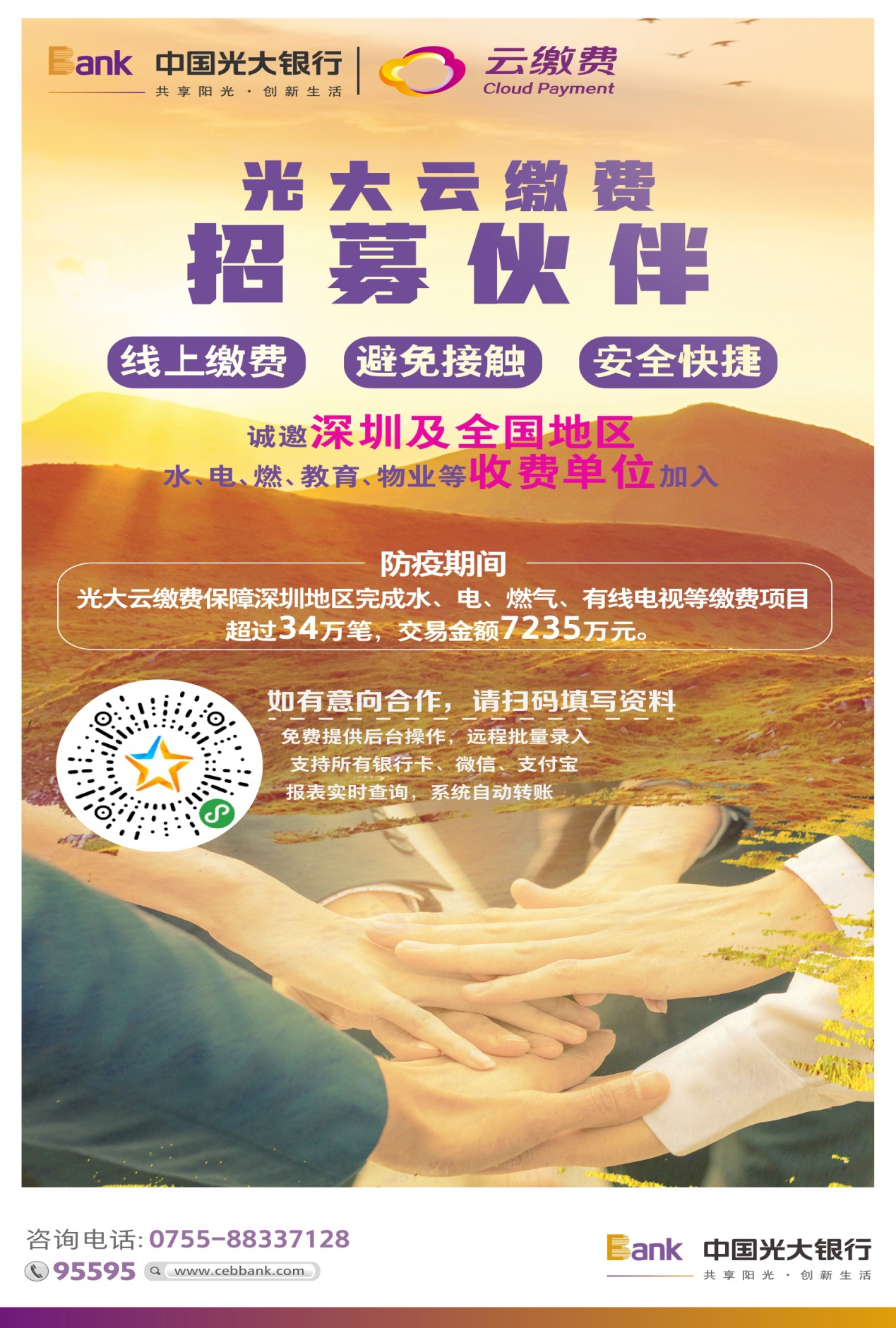 見圳客戶端·深圳新聞網(wǎng)2月26日訊 守望相助,共克時艱。面對新型冠狀病毒疫情防控的緊張形勢,為有效阻斷病毒傳播渠道,光大銀行深圳分行積極響應(yīng)國家號召,充分發(fā)揮云繳費(fèi)線上便民繳費(fèi)服務(wù)優(yōu)勢,全力保障全國,特別是重點地區(qū)水、電、燃等主要生活繳費(fèi)線上通道穩(wěn)定暢通運(yùn)行,足不出戶,完成各類繳費(fèi),最大限度降低了居民的出行風(fēng)險,全面助力打贏“防疫”阻擊戰(zhàn)。