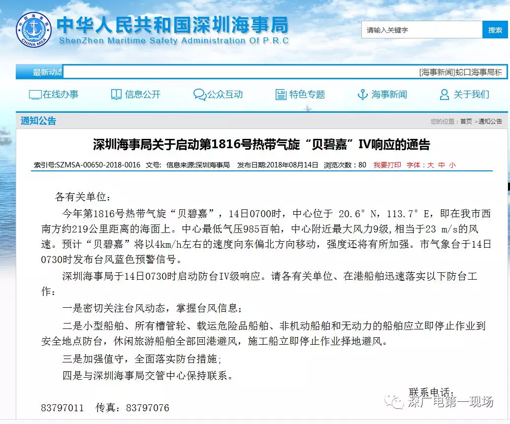 深圳海事局發(fā)布關于啟動第1816號熱帶氣旋“貝碧嘉”IV響應的通告