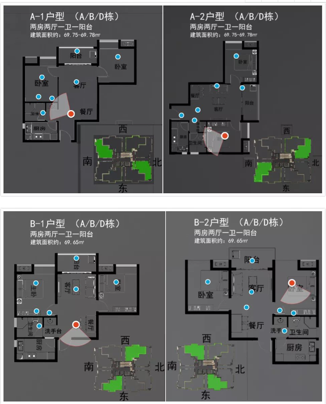 建筑面積約為66.2-69.81平方米的二房一廳696套,分別位于7棟A座、B座、D座。
