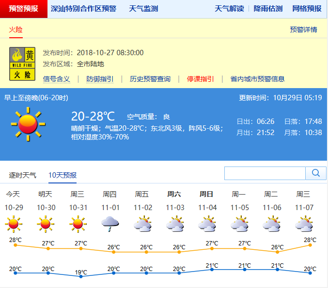 受偏北干燥氣流影響,28-30日我市晴天干燥,晝夜溫差大,早晚清涼,沿海最大陣風6級;31日-11月2日受“玉兔”和冷空氣共同影響,我市沿海和高地平均風力6-7級,偏北陣風8-9級。3日風力減弱。