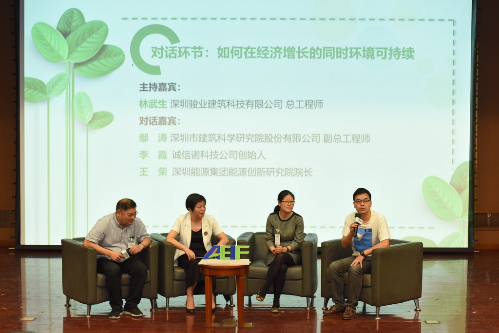 “如何在經(jīng)濟(jì)增長的同時(shí)環(huán)境可持續(xù)”是10月27日論壇的最后一個(gè)對話環(huán)節(jié),由深圳駿業(yè)建筑科技有限公司總工程師林武生擔(dān)任嘉賓主持,來自來自深圳能源集團(tuán)能源創(chuàng)新研究院的王榮院長、深圳市建筑科學(xué)研究院股份有限公司副總工程師鄢濤、誠信諾科技公司創(chuàng)始人李霞不僅對競賽單元的4個(gè)項(xiàng)目以及之前的嘉賓分享內(nèi)容進(jìn)行了點(diǎn)評和回顧,在介紹各自所在企業(yè)背景的基礎(chǔ)上,還從綠色建筑和清潔能源發(fā)展的角度進(jìn)行分析,如何在經(jīng)濟(jì)增長的同時(shí)堅(jiān)守環(huán)境底限,不做故作綠色的項(xiàng)目,從戰(zhàn)略到細(xì)節(jié)思考和實(shí)踐具有持續(xù)性的創(chuàng)新設(shè)計(jì)。