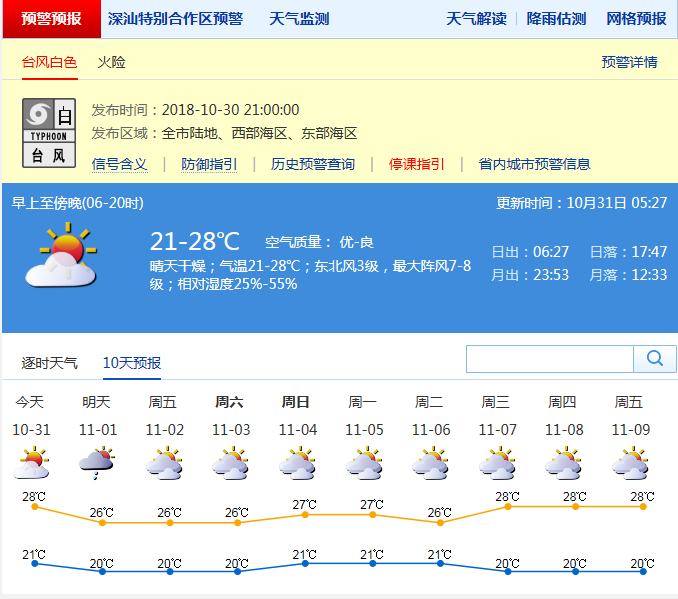 【深圳天氣趨勢】1日沿海和高地平均風(fēng)6級、最大陣風(fēng)8-9級,并伴有陣雨;2日風(fēng)力逐漸減弱;3-6日多云,氣溫回升。 今年第26號臺風(fēng)“玉兔”(強(qiáng)熱帶風(fēng)暴級)31日02時位于距離我市約788公里的南海海面上,預(yù)計將繼續(xù)偏西北行,1日轉(zhuǎn)向偏北至東北方向移動,強(qiáng)度明顯減弱。 深圳市氣象臺2018-10-31 05:27:00發(fā)布。