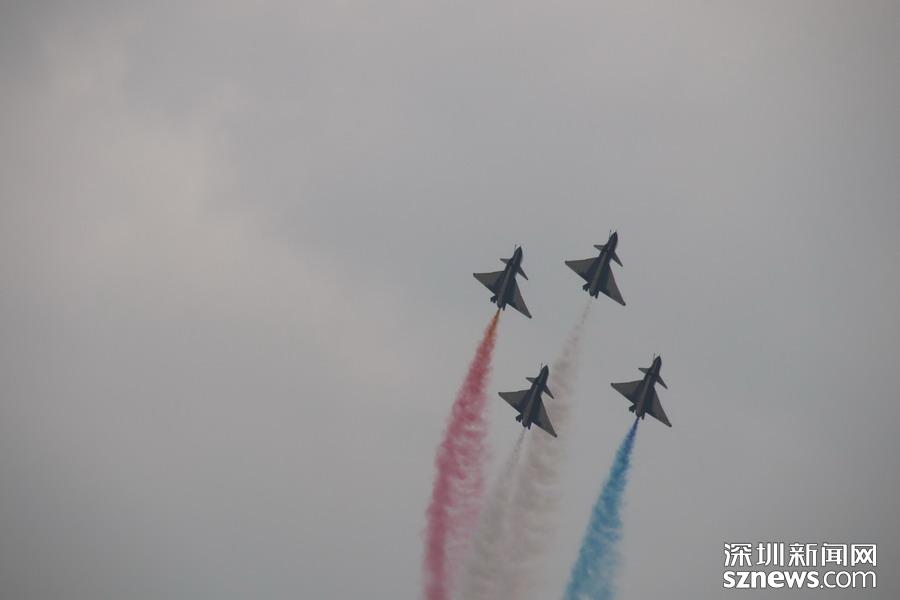 “八一”飛行表演隊(duì)的隊(duì)員則駕駛殲-10,展示了單機(jī)特技表演、六機(jī)編隊(duì)通場……戰(zhàn)機(jī)拉著彩煙,為觀眾帶來精彩的空中芭蕾。