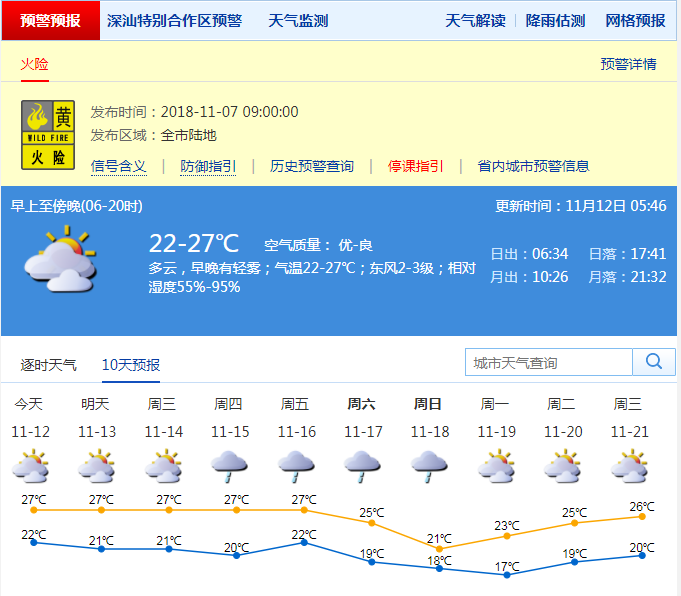12日陰天間多云,早晚有輕霧和輕微霾,氣溫22-27 ℃;周二(13日)多云,可見陽光,氣溫略升;周三到周六(14-17日)陰天間多云,間中有零星小雨,雨時能見度較低,氣溫小幅波動;周日(18日)陰天有短時小雨,氣溫下降,北風(fēng)加大。