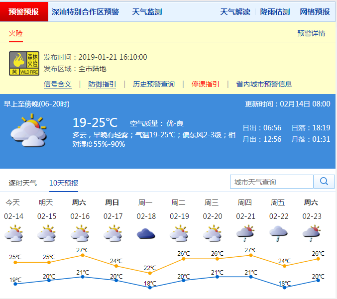 記者從深圳市氣象局了解到,14日深圳全市多云為主,氣溫19-25℃,相對濕度70%-90%,偏東風(fēng)2-3級,能見度8-18公里。值得一提的是,今天距離深圳平均入冬日:1月13日已經(jīng)過去一個(gè)月了,今年直接入夏的可能性越來越大。