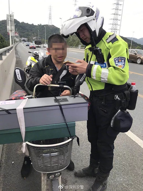 2月14日上午,深圳交警巡邏至南坪快速長嶺陂大橋時發(fā)現一輛非機動車上快速路。上前詢問后得知,男子是幫客戶送禮物的,不料卻迷路了,這才誤闖了快速路。蜀黍對其教育后,迅速將當事人護送下快速路路口。