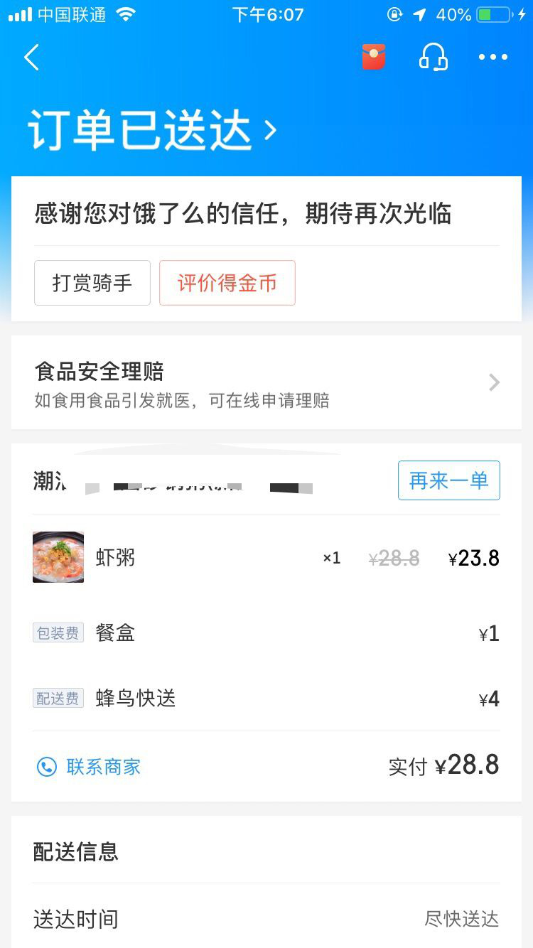 2月12日上午10點多,市民黃先生在餓了么外賣平臺點了一份潮汕砂鍋粥。2個小時后,肚子快餓癟的黃先生等到了外賣小哥的電話。外賣小哥告訴他,外賣在電動車上被偷了,對此很抱歉,麻煩黃先生重新點餐,并希望添加他的微信進(jìn)行賠償。