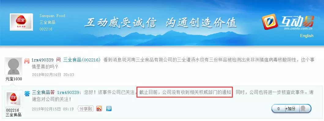 中新經(jīng)緯客戶端報(bào)道,14日晚間,有投資者在深交所互動(dòng)平臺(tái)上提問(wèn)三全食品稱,有消息稱三全灌湯水餃有三份樣品被檢測(cè)出非洲豬瘟病毒核酸陽(yáng)性,該事件是否真實(shí)?