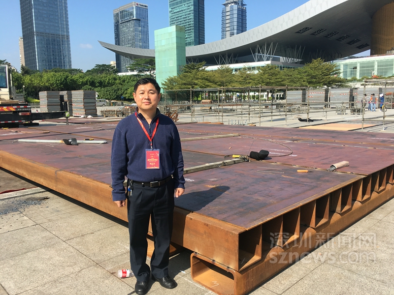 王啟文他們決定采用“遇河架橋”的思路,以跨越方式,在12米的方型鋼管梁鋪上鋼板,沿軸線位置設(shè)一個縱向梁,再通過3米的橫梁跨越過去。相當(dāng)于在市民中心的采光帶上架了一座橋,所有的舞臺搭設(shè)都在“橋”面上施工。由于方案和施工緊急,從安全考慮,設(shè)計(jì)單位還為這個工程做了及時的變形觀測,鋪設(shè)了很多傳感儀,每天都在傳輸舞臺搭建后對地面造成的變形數(shù)據(jù),為舞臺的安全搭建提供技術(shù)支持。