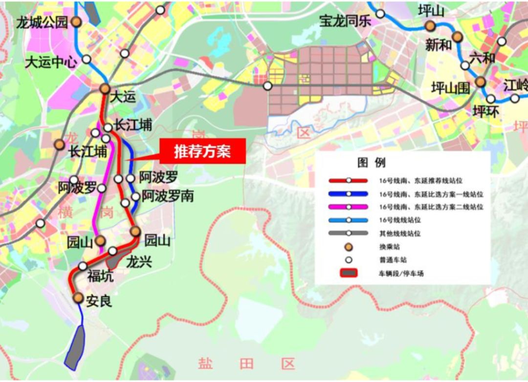 16號(hào)線南延對(duì)于支持重點(diǎn)產(chǎn)業(yè)區(qū)發(fā)展、強(qiáng)化龍崗中心城與橫崗、鹽田的區(qū)域聯(lián)系、構(gòu)筑城際樞紐具有重要意義。線路從大運(yùn)站引出,沿龍崗大道敷設(shè),轉(zhuǎn)入長(zhǎng)江埔路并設(shè)長(zhǎng)江埔站,然后向南進(jìn)入阿波羅產(chǎn)業(yè)園并設(shè)阿波羅站,繼續(xù)向南進(jìn)入阿波羅產(chǎn)業(yè)區(qū)并設(shè)阿波羅南站,向南進(jìn)入萬(wàn)福路并設(shè)園山站,然后沿公園路敷設(shè),轉(zhuǎn)入沙荷路在沙荷路與龍興路交叉口設(shè)龍興站,在沙荷路與安業(yè)路交叉口設(shè)??诱?,最后沿惠鹽中路進(jìn)入安良村,設(shè)終點(diǎn)站安良站。線路全長(zhǎng)約7.8km,采用地下敷設(shè)。
