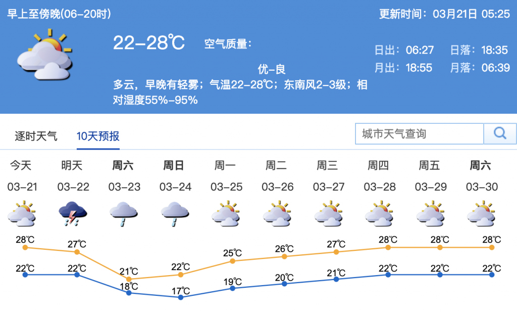 距離深圳平均入夏時間4月21日還有一個月,市民們也許已經(jīng)有了初夏般的感受。預(yù)計(jì)21日多云間陰天,早晚有輕霧,氣溫23~28 ℃。