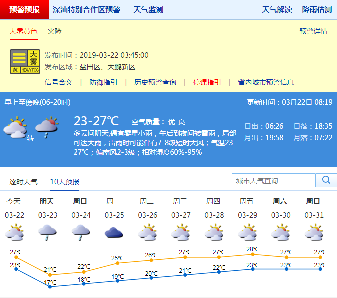 深圳新聞網(wǎng)2019年3月22日訊 記者從深圳市氣象局獲悉,今日白天轉(zhuǎn)陣雨或雷雨,局部可達(dá)大雨,并可能伴有7-8級短時大風(fēng);23-24日云量較多伴有小雨,氣溫下降5-6℃,天氣轉(zhuǎn)涼;25日轉(zhuǎn)多云,氣溫回升。