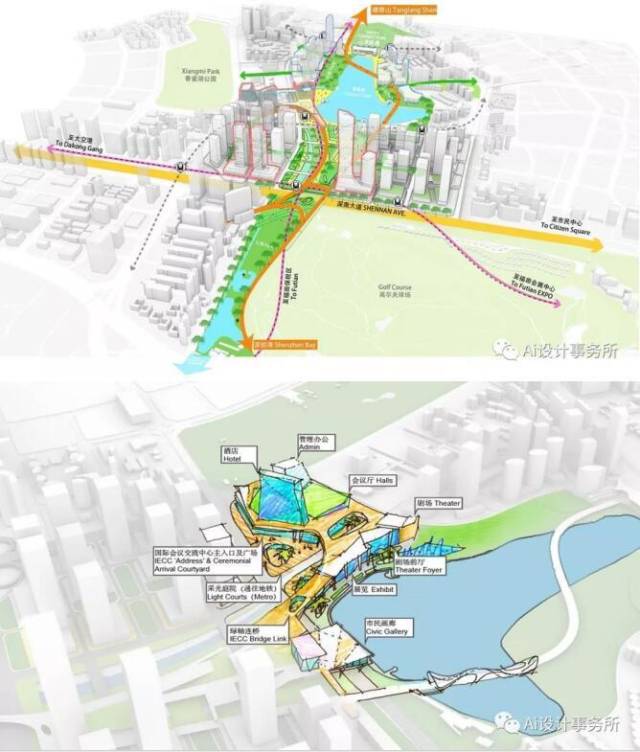 該方案中規(guī)劃了國(guó)際交流會(huì)議中心、城市演藝中心、城市博物館及雙子金融大廈等,以及地景式過街天橋、中央綠谷公園等。