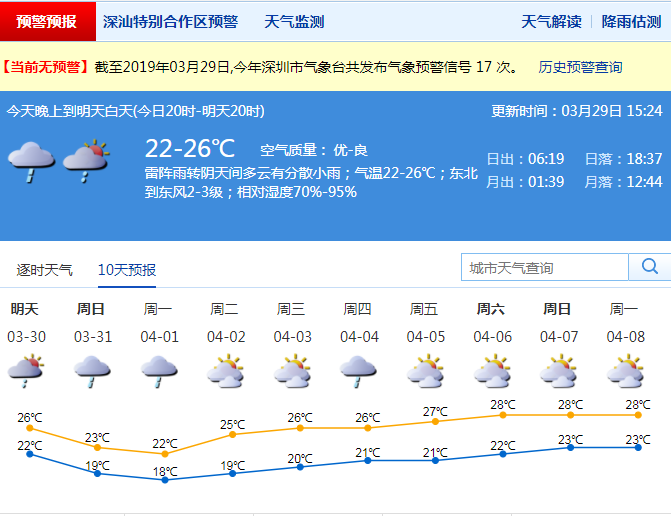 深圳新聞網(wǎng)2019年3月29日訊 記者從深圳氣象局了解到,昨天夜間到今天白天,我市多云,夜間到早晨有輕霧,局地大霧;早晨最低氣溫22-23℃,白天最高氣溫27-28℃;相對(duì)濕度70%-100%;南風(fēng)2-3級(jí);昨天夜間能見(jiàn)度1-5公里。東部局地有大霧能見(jiàn)度在1公里以下,白天能見(jiàn)度轉(zhuǎn)好達(dá)到10-20公里。