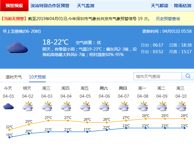 深圳新聞網(wǎng)2019年4月1日訊 今日深圳陰天,有分散小雨;受冷空氣影響,氣溫下降,天氣稍涼,氣溫18-22℃;偏東風(fēng)3級,沿海和高地最大陣風(fēng)7級;相對濕度65%-95%。4月2日至清明假期多云為主,間有陣雨和輕霧,氣溫逐漸回升。