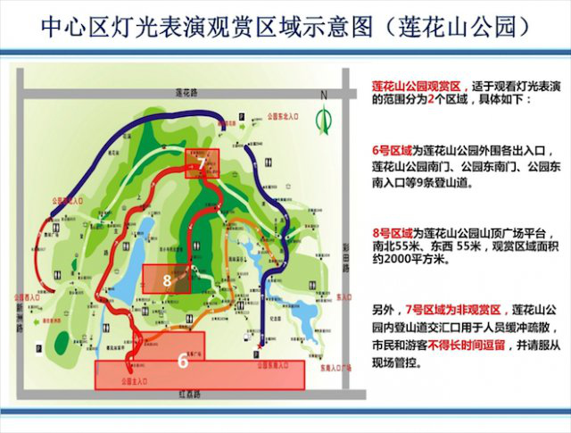 ▲中心區(qū)燈光表演觀賞區(qū)域示意圖(含市民中心廣場(chǎng)和蓮花山公園)