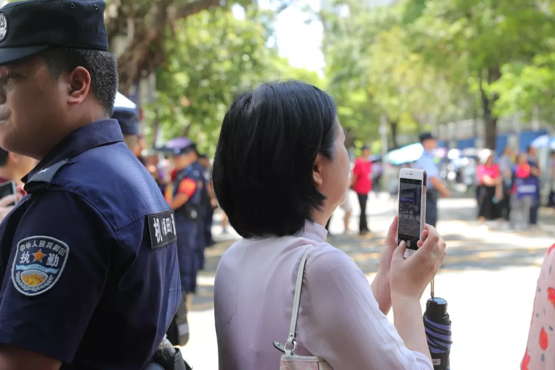 △考場外焦急等待的考生家長紛紛拿出手機(jī)準(zhǔn)備拍攝邁出考場的孩子。