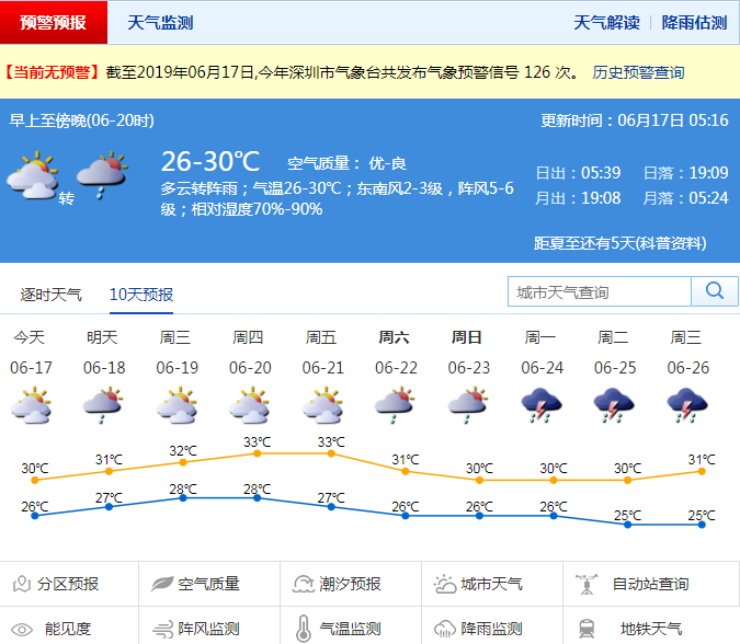 深圳新聞網(wǎng)2019年6月17日訊 深圳市氣象局預計17日白天有陣雨或雷陣雨,局部大雨;18日多云有短時陣雨或雷陣雨;19-20日多云間晴,局部地區(qū)有短時陣雨,天氣炎熱;21日多云有短時陣雨。22-24日,陰天,有陣雨或雷陣雨。