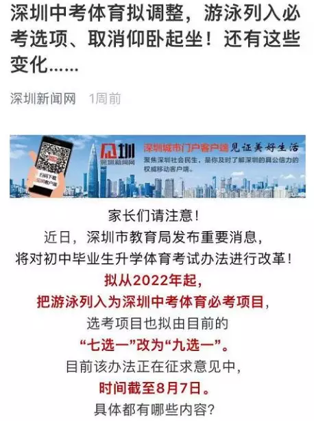 調(diào)整后,深圳體育中考分?jǐn)?shù)由統(tǒng)一現(xiàn)場考試成績分值32分、過程性考核(平時成績)分值12分和《國家學(xué)生體質(zhì)健康標(biāo)準(zhǔn)》測試分值6分組成,滿分為50分。其中,體育考試考試項目仍為“1+1”,即考生參加1項必考科目和1項選考項目。必考科目由現(xiàn)在的200米跑和中長跑(800米[女]和1000米[男])任選其一調(diào)整為中長跑(800米[女]和1000米[男])或100米游泳任選其一。
