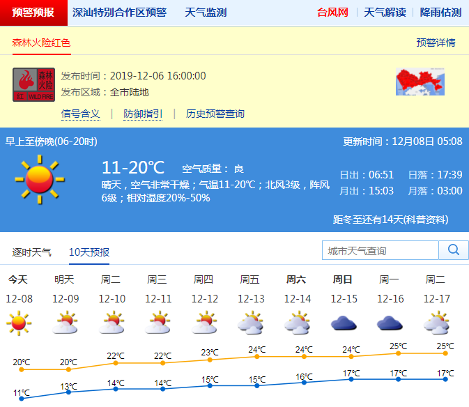 深圳市氣象局預(yù)計(jì)8日晴天間多云,空氣非常干燥;氣溫10-20℃;偏北風(fēng)3-4級(jí);相對(duì)濕度20%-50%。9-11日晴天間多云,空氣非常干燥,氣溫逐日回升,12-13日多云,晝夜溫差減小。