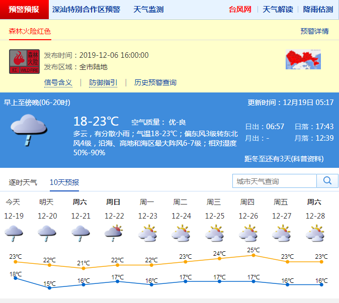 見圳客戶端·深圳新聞網(wǎng)2019年12月19日訊 深圳市氣象局預(yù)計(jì)18日夜間至21日冷空氣影響,轉(zhuǎn)陰天,有分散小雨,沿海、高地和海區(qū)陣風(fēng)6-7級,氣溫下降,20日最低氣溫15℃;22日午后轉(zhuǎn)多云,23-25日可見陽光,氣溫回升。