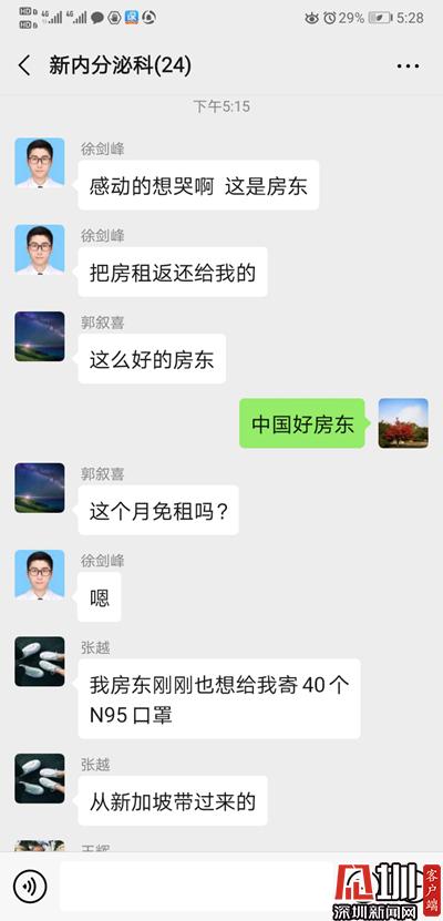 2日上午,寶安中醫(yī)院(集團)隔離病房工作的徐醫(yī)生,遇到了令他十分感動的事。他通過微信向房東交房租,房東問他是不是在防控前線工作,徐醫(yī)生以為房東怕傳染而嫌棄他,連忙向房東解釋自己做好了防護消毒,不用擔心,沒想到房東直接把房租退了回去,表示要支持徐醫(yī)生在前線工作,真是暖心?。?br/>