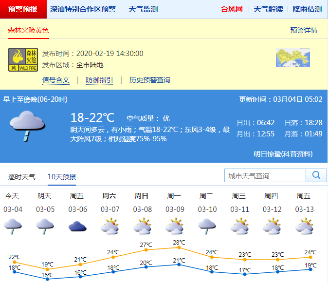 見圳客戶端·深圳新聞網(wǎng)2020年3月4日訊 深圳市氣象臺預(yù)計,4日我市陰天間多云有小雨,氣溫18-22℃,東風3-4級,夜間起沿海和高地有7-8級陣風;5日小雨局部中雨,伴有零散雷暴,明顯轉(zhuǎn)涼;6日偶有分散小雨;7日起轉(zhuǎn)多云,氣溫回升。