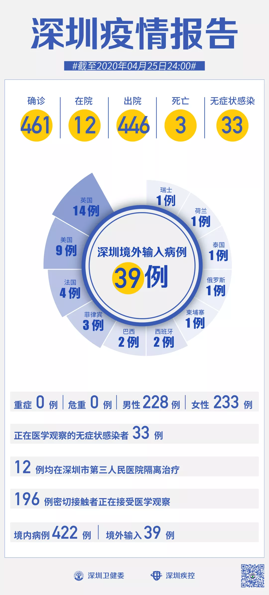 截至4月25日24時,深圳累計報告新冠肺炎病例461例。