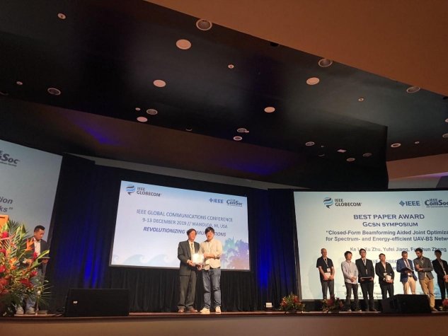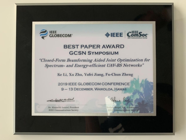 日前,由哈工大(深圳)電子與信息工程學(xué)院2017級(jí)碩士研究生李可擔(dān)任第一作者,朱旭教授、蔣宇飛助理教授、鄭福春教授為共同作者,哈工大(深圳)為第一通訊單位完成的論文《三維波束成形輔助的高譜效和能效的無(wú)人機(jī)基站網(wǎng)絡(luò)的聯(lián)合優(yōu)化》(“Closed-Form Beamforming Aided Joint Optimization for Spectrum- and Energy-Efficient UAV-BS Networks”)入選通信領(lǐng)域頂級(jí)會(huì)議Globecom2019 (IEEE Global Communications Conference2019),并獲得最佳論文獎(jiǎng)。
