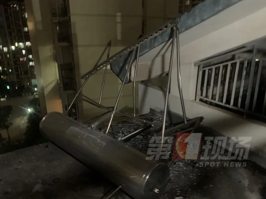 其中,龍華民治春華四季園42棟高層的儲(chǔ)水箱,砸到了樓下藍(lán)色轎車,造成車輛發(fā)動(dòng)機(jī)蓋一處凹陷,多處刮痕。