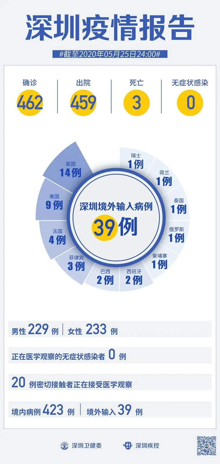 截至5月25日24時,深圳累計報告新冠肺炎病例462例。