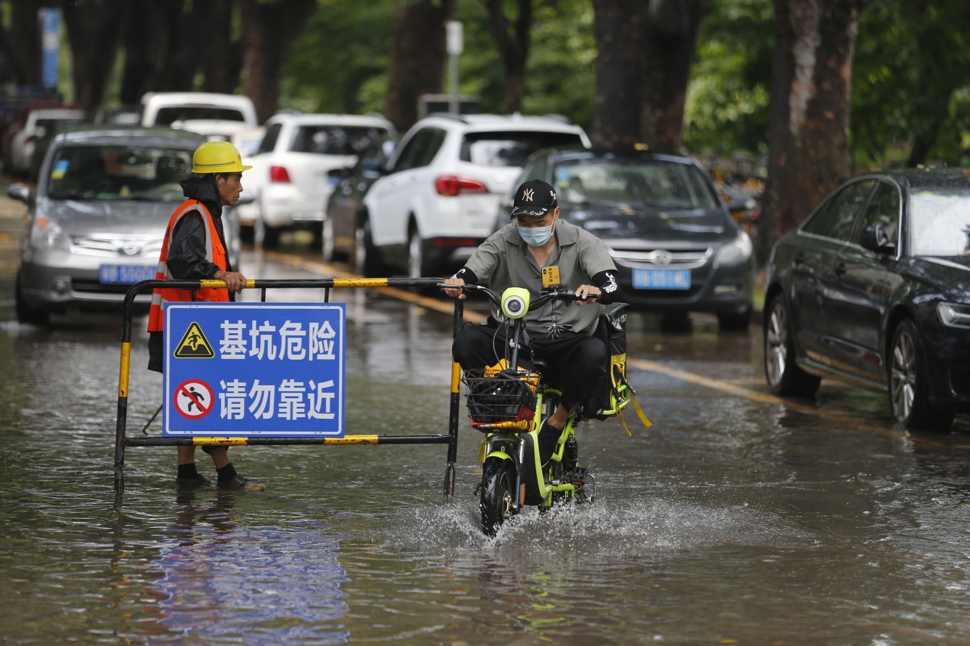 2020年5月26日中午13:46分,商報東二路,短時強(qiáng)降水導(dǎo)致路面水浸,一位騎士經(jīng)過水浸路面。
