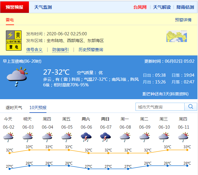 市氣象臺預(yù)測,3-4日有短時陣雨或雷陣雨,天氣悶熱。5-7日有陣雨或雷陣雨,部分時間雨勢較大。近期西南季風活躍,降雨局地性明顯,降雨較急,注意防范局地雷雨及其引發(fā)的水浸、地質(zhì)災(zāi)害等次生災(zāi)害。