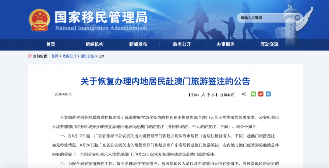 國家移民管理局官網(wǎng)8月11日消息,為貫徹落實國務院聯(lián)防聯(lián)控機制關于統(tǒng)籌做好常態(tài)化疫情防控和逐步恢復內(nèi)地與澳門人員正常往來的部署要求,公安機關出入境管理部門將分區(qū)域分步驟恢復辦理內(nèi)地居民赴澳門旅游簽注(含團隊旅游、個人旅游簽注,下同)。