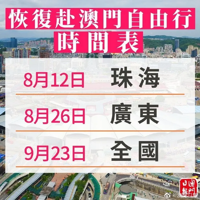 一、自8月12日起,廣東省珠海市公安機關出入境管理部門恢復辦理珠海市居民(含居住證持有人,下同)赴澳門旅游簽注;如無特殊情況,8月26日起,廣東省公安機關出入境管理部門恢復辦理廣東省居民赴澳門旅游簽注;在內(nèi)地與澳門疫情形勢繼續(xù)總體向好的前提下,全國公安機關出入境管理部門于9月23日起恢復辦理內(nèi)地居民赴澳門旅游簽注。