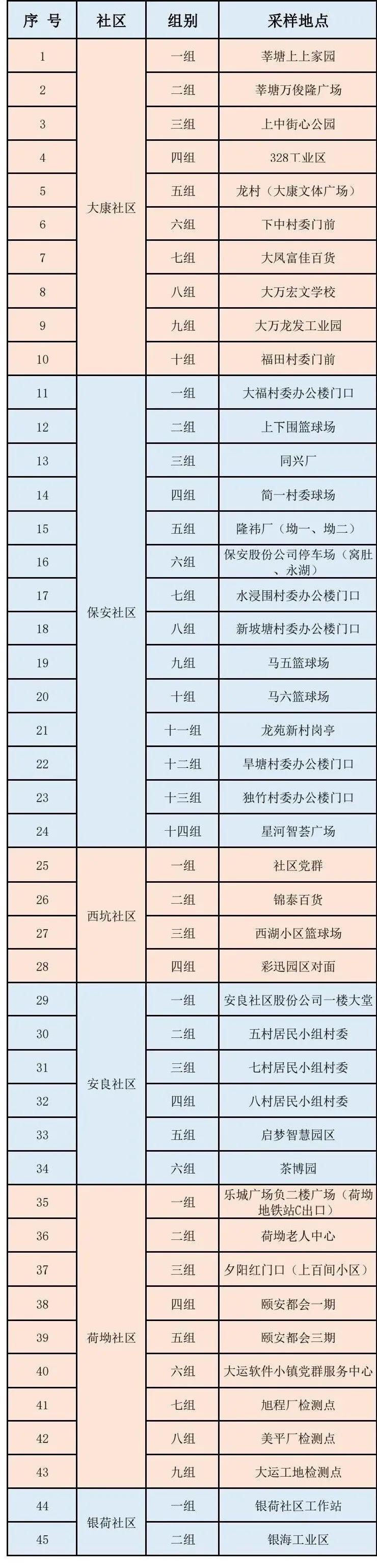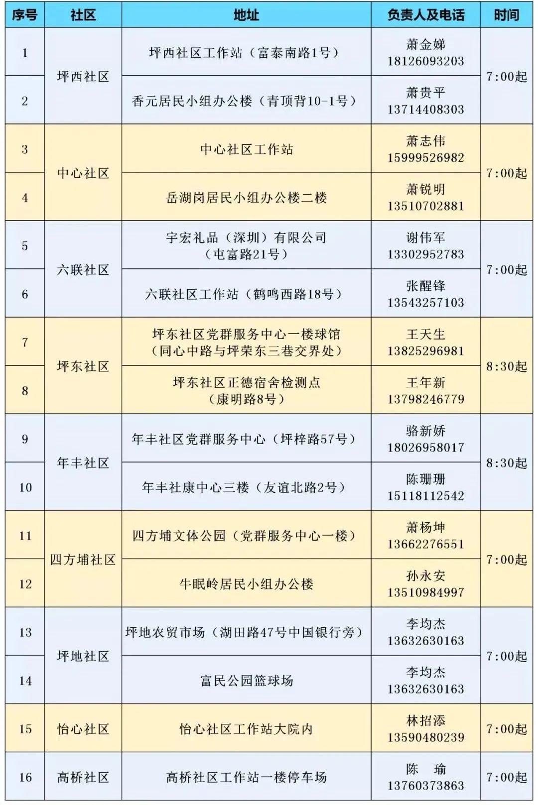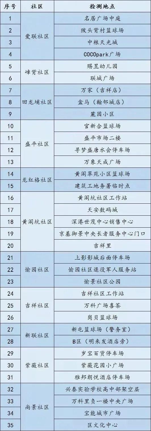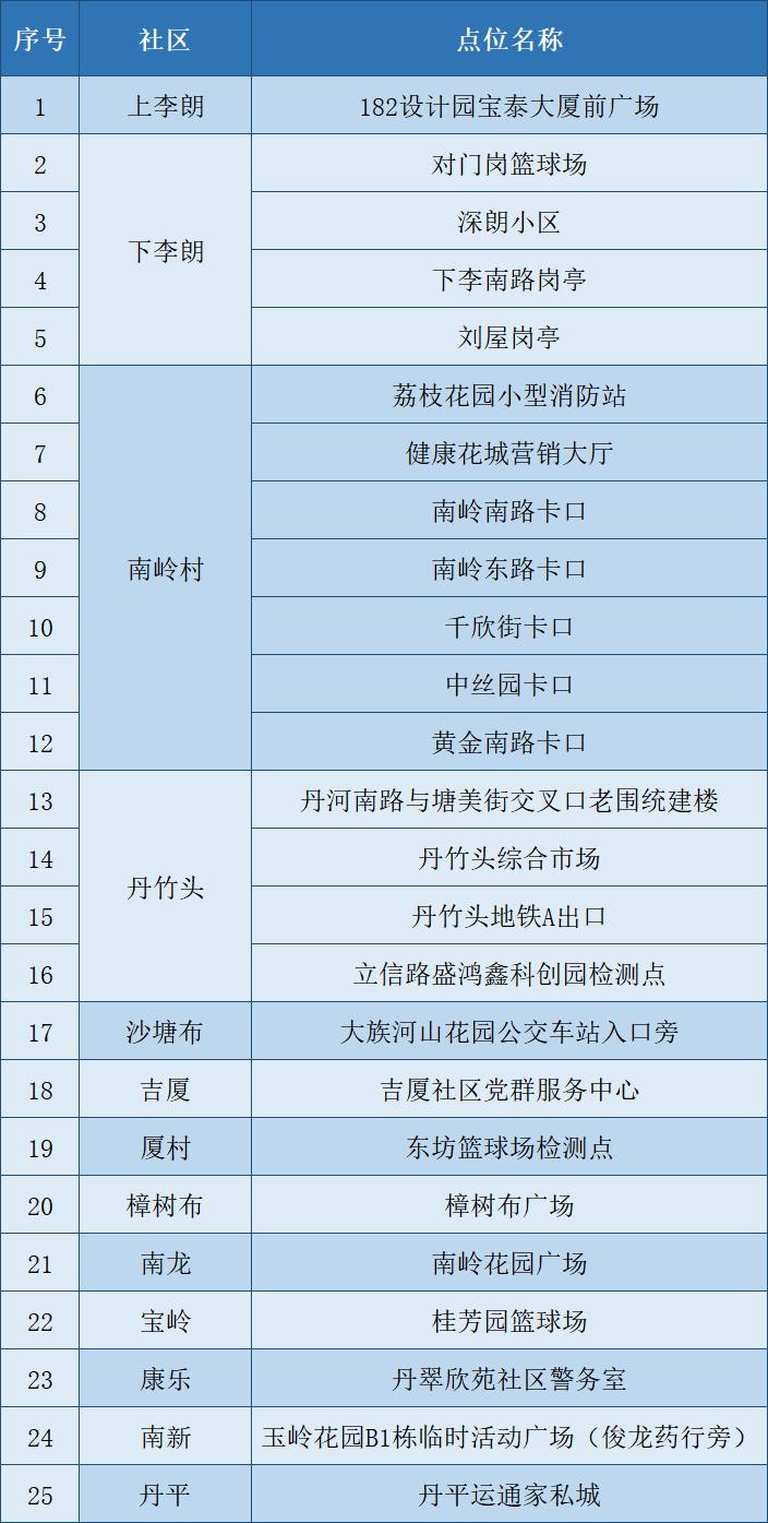 根據(jù)疫情防控需要,為最大程度保障人民群眾生命安全和身體健康,龍崗區(qū)各街道于1月10日開展新一輪免費(fèi)核酸檢測以下點(diǎn)位統(tǒng)計截至1月10日。各點(diǎn)位動態(tài)更新請以社區(qū)通知及現(xiàn)場實際情況為準(zhǔn)。