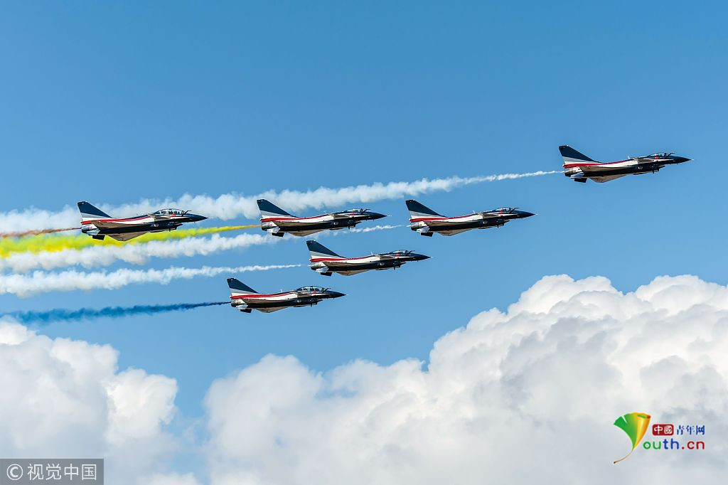 2018年11月8日,廣東珠海,第十二屆中國國際航展第三天??哲姟鞍艘弧憋w行表演隊的隊員們,發(fā)揚連續(xù)作戰(zhàn)精神,給觀眾們表演了七機分組開花、四機編隊橫滾等高難動作,受到觀眾們的稱贊。視覺中國