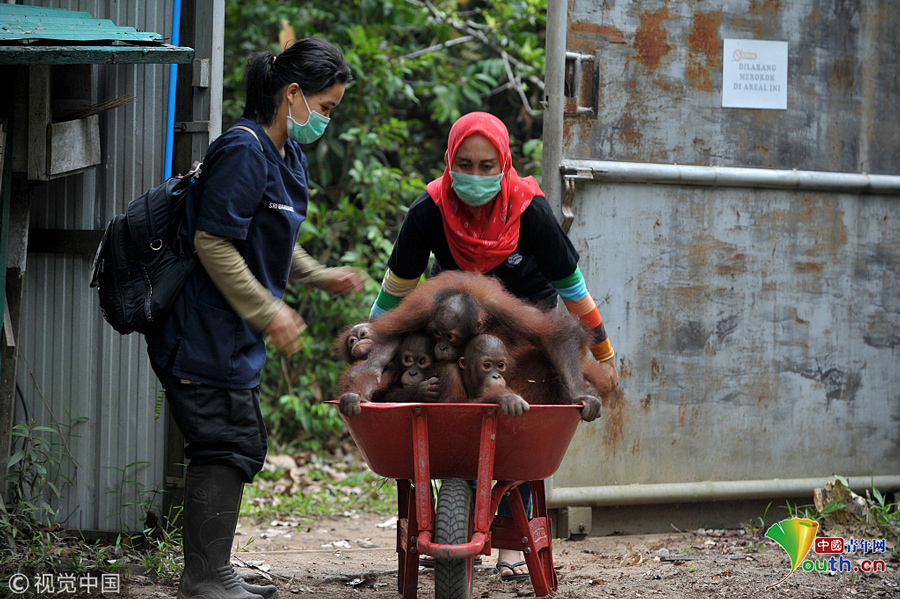 當(dāng)?shù)貢r間2018年9月18日,印尼加里曼丹克塔邦,國際動物救援(IAR)猩猩安全與保護中心里,飼養(yǎng)員用獨輪車把猩猩寶寶送到森林學(xué)校。圖片作者:Newscom