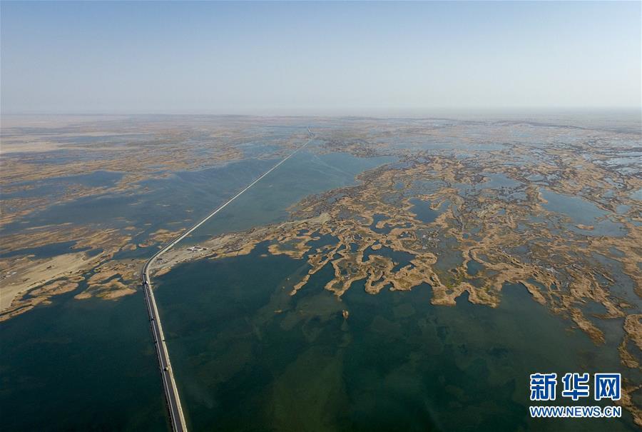 218國道在塔里木河尾閭——臺特瑪湖中間延伸(2017年10月22日無人機(jī)拍攝)。 新華社記者 趙戈 攝