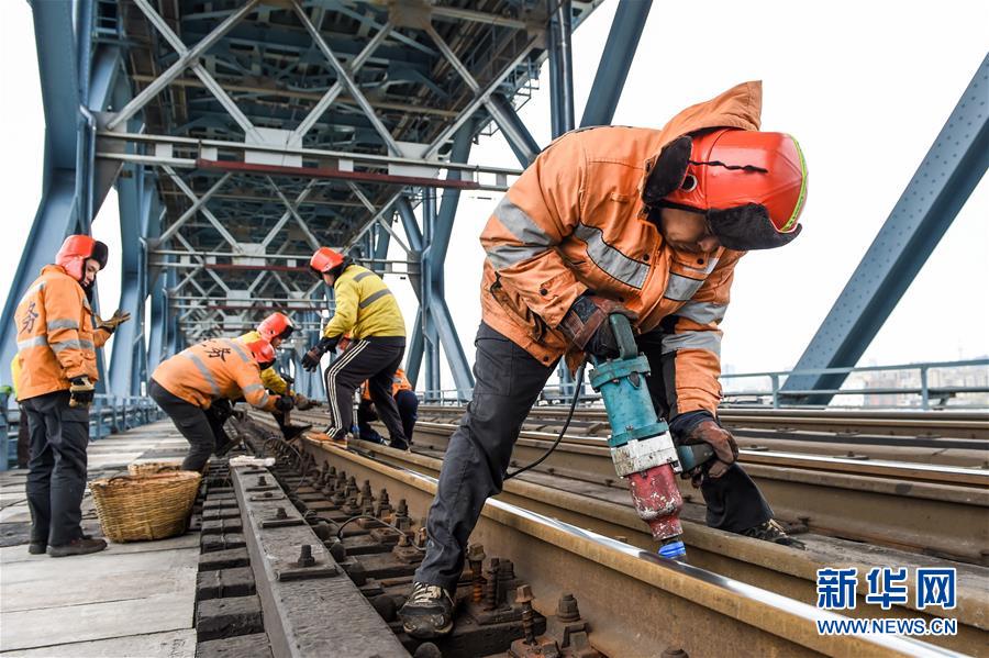 線路工劉非(右一)在南京長江大橋鐵路橋進(jìn)行木枕改道作業(yè)(12月27日攝)。