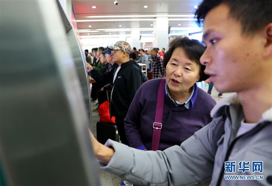 1月15日,廣東湛江青年許東濱(右)在廣州火車站售票大廳內(nèi)的自助售票終端上買完車票后,順便幫助一位老人查詢車票信息。 為適應(yīng)互聯(lián)網(wǎng)購票旅客比重持續(xù)上升趨勢,廣州火車站在籌備2019年春運(yùn)票務(wù)業(yè)務(wù)時,優(yōu)化互聯(lián)網(wǎng)購票取票和退改簽業(yè)務(wù)辦理流程設(shè)計,提升效率,方便旅客出行。 新華社記者劉大偉攝
