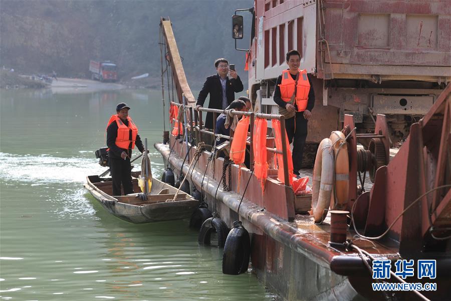 1月22日,何銀祥(左)在駕駛小船,他駕駛的小船是大船的動力來源。 新華社記者 歐東衢 攝