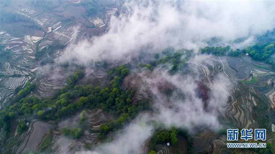 這是在云南省元陽縣拍攝的傍晚時分的哈尼梯田美景(4月3日無人機拍攝)。哈尼梯田位于云南省哀牢山南部,以哈尼族為主的當?shù)厝罕娗О倌陙砩幌⒃诖蟮厣稀暗窨獭背鲞@一農(nóng)耕文明奇觀。春日里,漫山的水稻梯田與云海、森林、村莊形成一幅美麗的畫卷,吸引眾多海內(nèi)外游客前來觀賞。新華社記者 胡超 攝