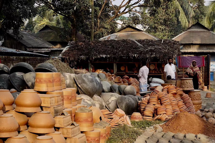 達(dá)卡遠(yuǎn)郊區(qū)一個(gè)印度教徒聚居的村莊,幾乎家家戶(hù)戶(hù)都開(kāi)辦制陶作坊,以傳統(tǒng)工藝制作陶盆、陶罐、陶盤(pán)和建筑裝飾陶器,遠(yuǎn)銷(xiāo)孟加拉國(guó)內(nèi)各地。李仁奇 攝