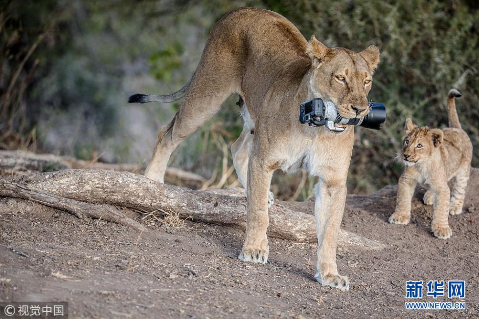 近日,非洲博茨瓦納馬沙圖野生動物保護區(qū)內(nèi)一頭獅子叼起攝影師掉落在地上的相機,之后還將相機交給小獅子們玩耍,看起來十分好奇,而攝影師非常無奈。現(xiàn)年57歲的叢林探險家Barbara Jensen Vorster在一輛越野車上為馬沙圖野生動物保護區(qū)的獅群拍照時,相機不小心掉到了地上。砰的一聲響驚動了母獅子,它向攝影師方向移動,迫使探險隊撤退。(圖片來源:視覺中國)