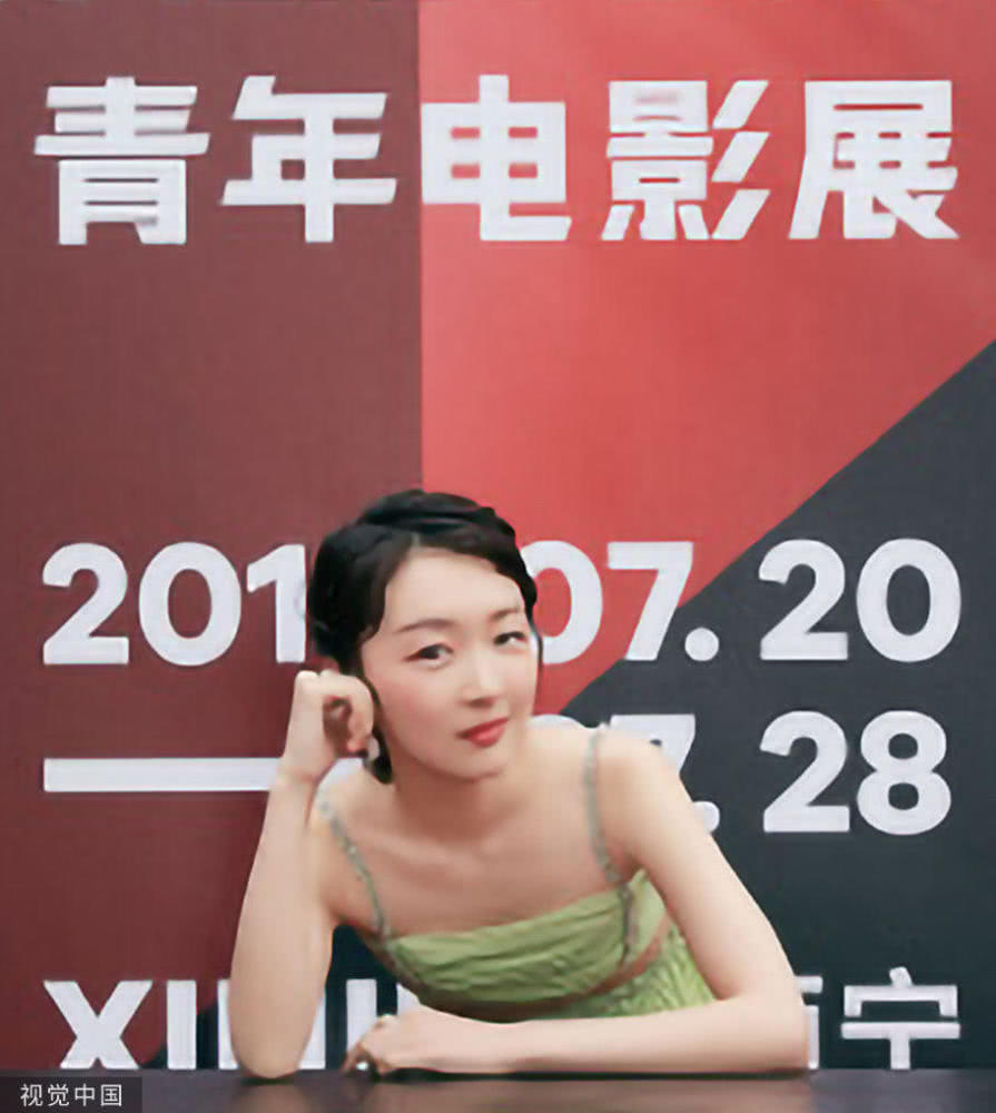 周冬雨穿牛油果綠吊帶裙清新可人,趴桌臺(tái)俏皮擺拍落落大方;圖片來源:視覺中國(guó)