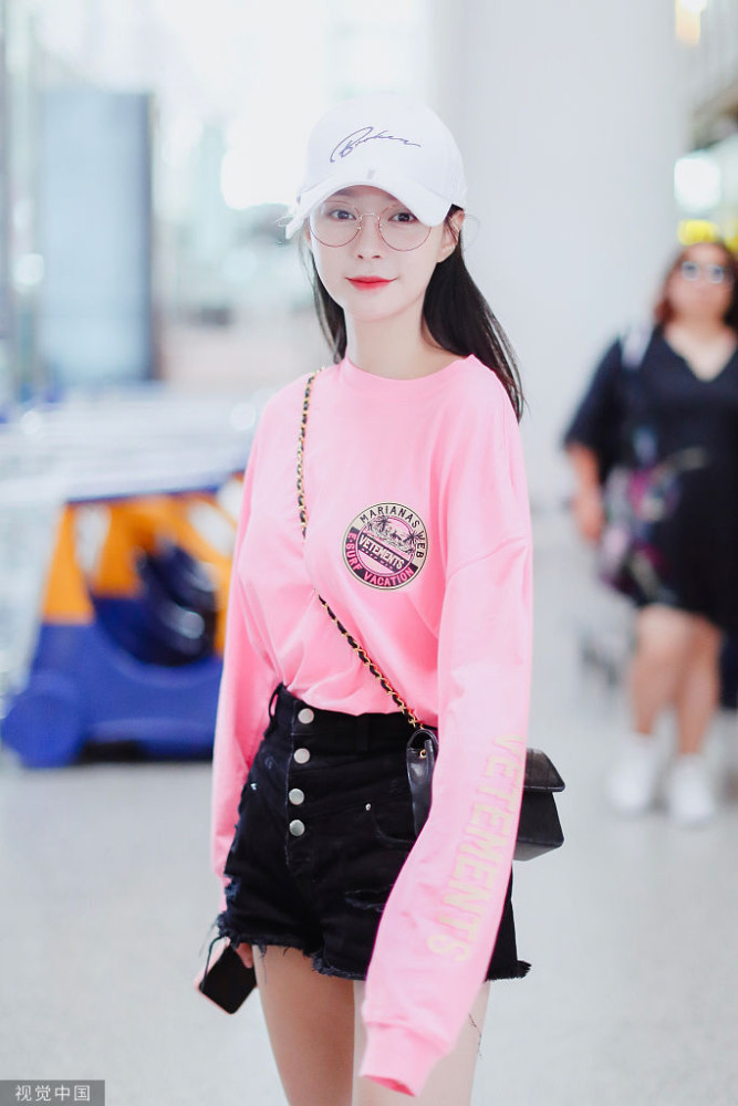 她戴著棒球帽身穿粉色衛(wèi)衣搭配熱褲,長腿纖細又白嫩。
